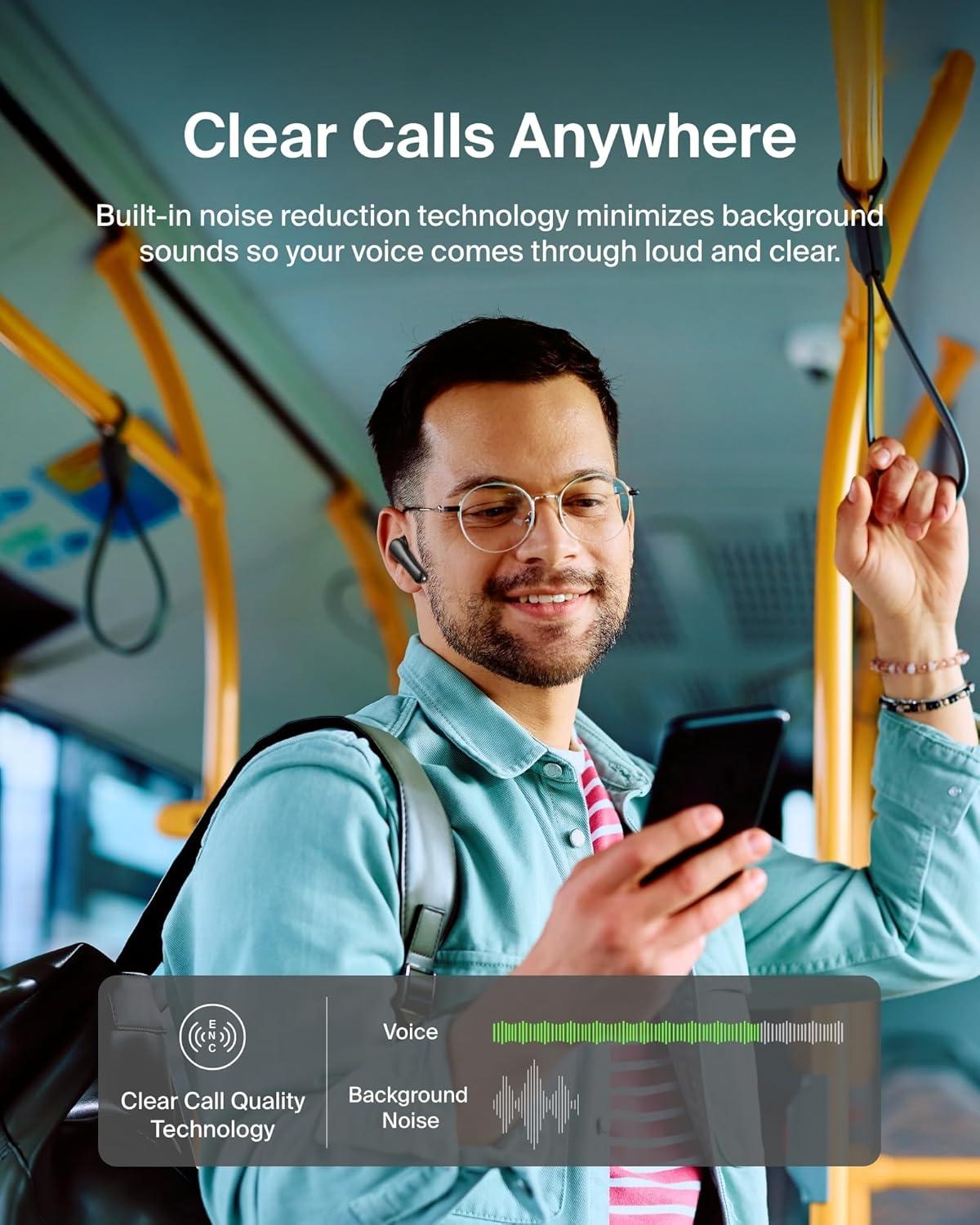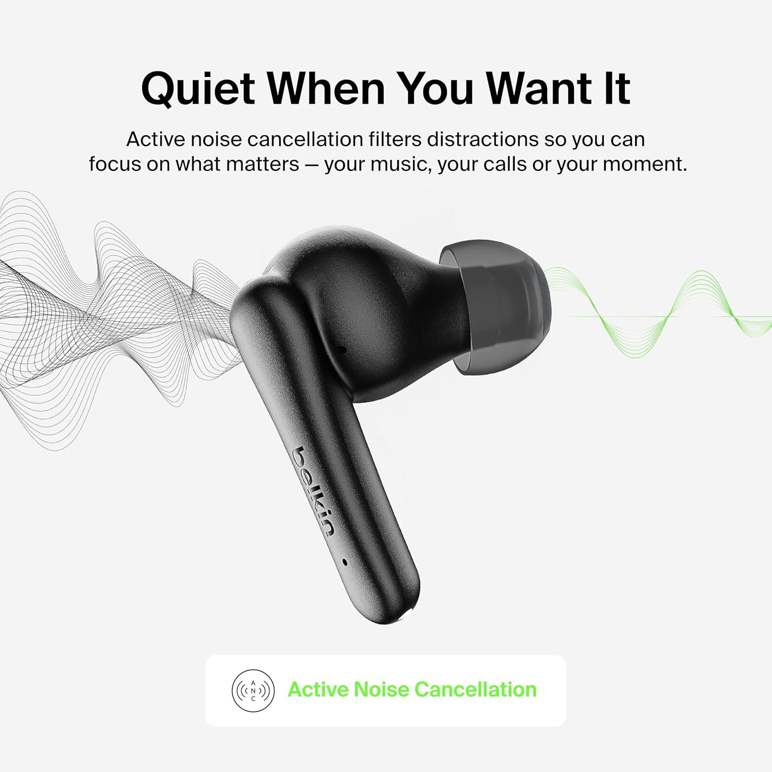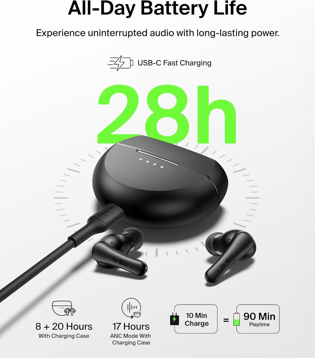 Belkin SoundForm Rhythm ANC True Wireless Earbuds w/Built-in Microphone, USB C Fast Charging, 28H Battery Life, IPX5 Water Resistance – Bluetooth Earbuds for iPhone, iPad, Galaxy, Pixel, etc. – Black