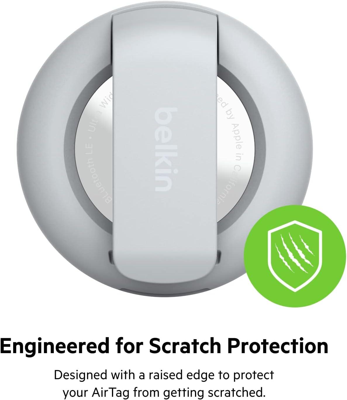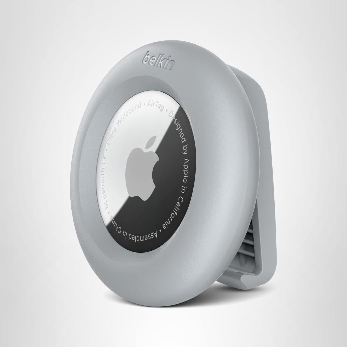 Belkin Apple AirTag Secure Holder with Clip – Durable Scratch Resistant Case Air Tag Spring Loaded Attach to Backpack, Clothing, and Luggage Black(Light Gray)