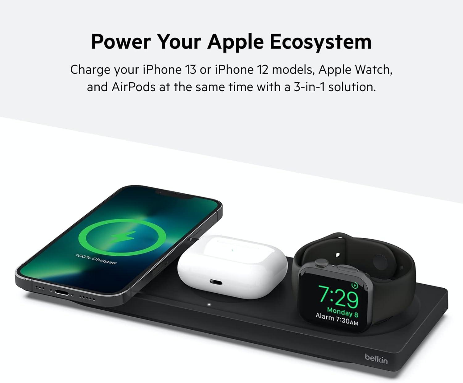 The Belkin MagSafe 3-in-1 Wireless Charging Pad is the perfect way to keep your devices charged and ready to go. This iPhone charger has three charging modules that can wirelessly charge your Apple iPhone, Apple Watch, and AirPods all at the same time.