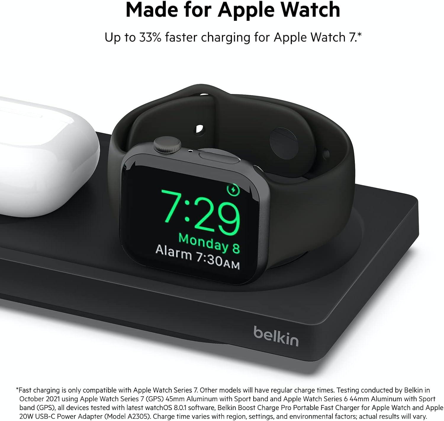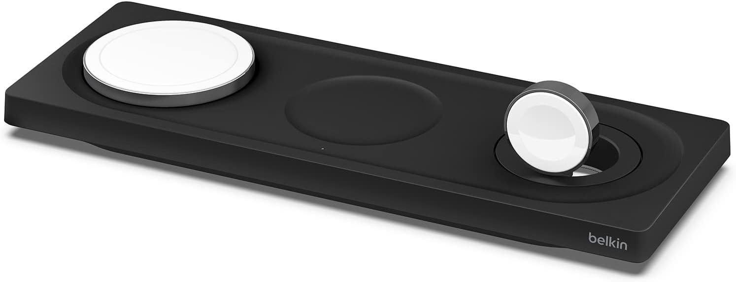 The Belkin MagSafe 3-in-1 Wireless Charging Pad supports multiple device orientations, just place your iPhone on the charging pad for a secure, aligned connection. The wireless charging puck and pad are optimized for your Apple Watch, AirPods and AirPods Pro. With its slim design and folding plug prongs, it’s easy to slip into your bag for travel. And if you have multiple devices that use wireless charging, this is the perfect option for keeping them all charged while on the go.