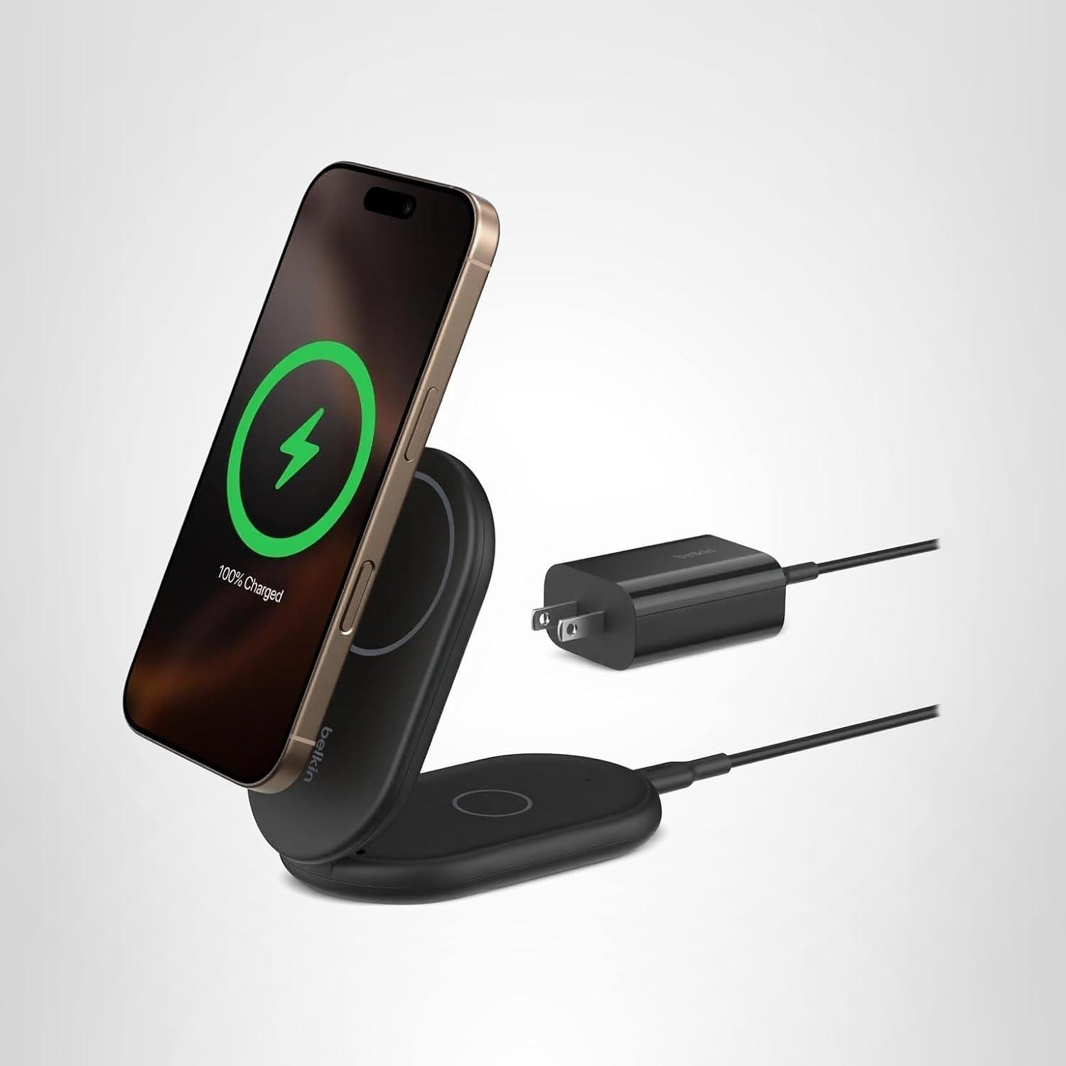 Belkin Magnetic Foldable Wireless Charging Stand 15W – MagSafe-Compatible Qi2-Certified Charger, Wireless Charging Stand for iPhone 16, Galaxy S25, & More – Standby Mode Ready w/PSU Included – White(Black)