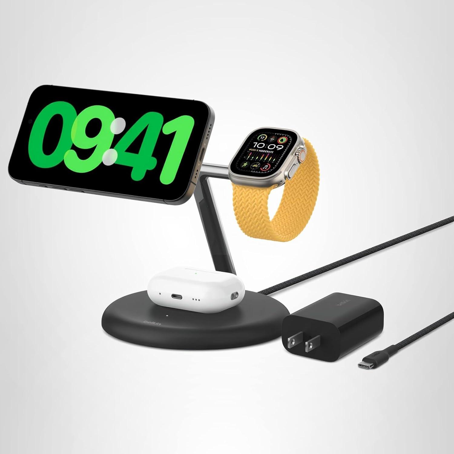 Belkin MagSafe-Compatible Charger, 3-in-1 Wireless Charging Station, Qi2-Certified 15W Wireless Charge for Apple iPhone 17 Series, Apple Watch, AirPods w/Non-Slip Base, 40W Included – Black(Black)