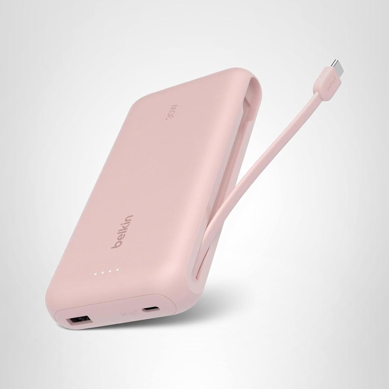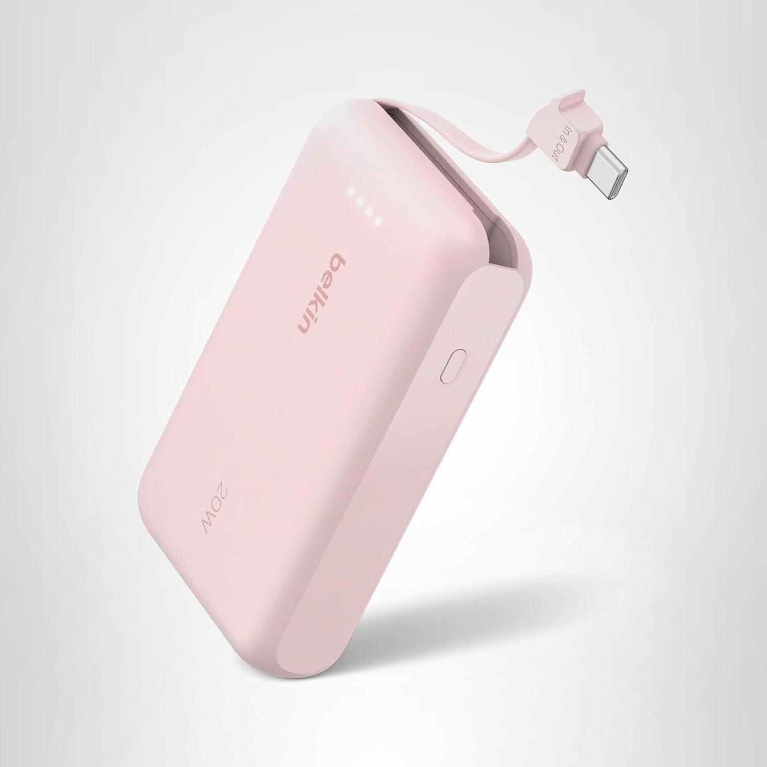 Belkin Portable Charger, Power Bank 10000 mAh w/Integrated Cable – 20W Fast Charge USB-C Power Delivery, iPhone Charger – Apple iPhone 17, Air, Pro, Pro Max, iPad, Samsung Galaxy S25, & More – Black(Pink)