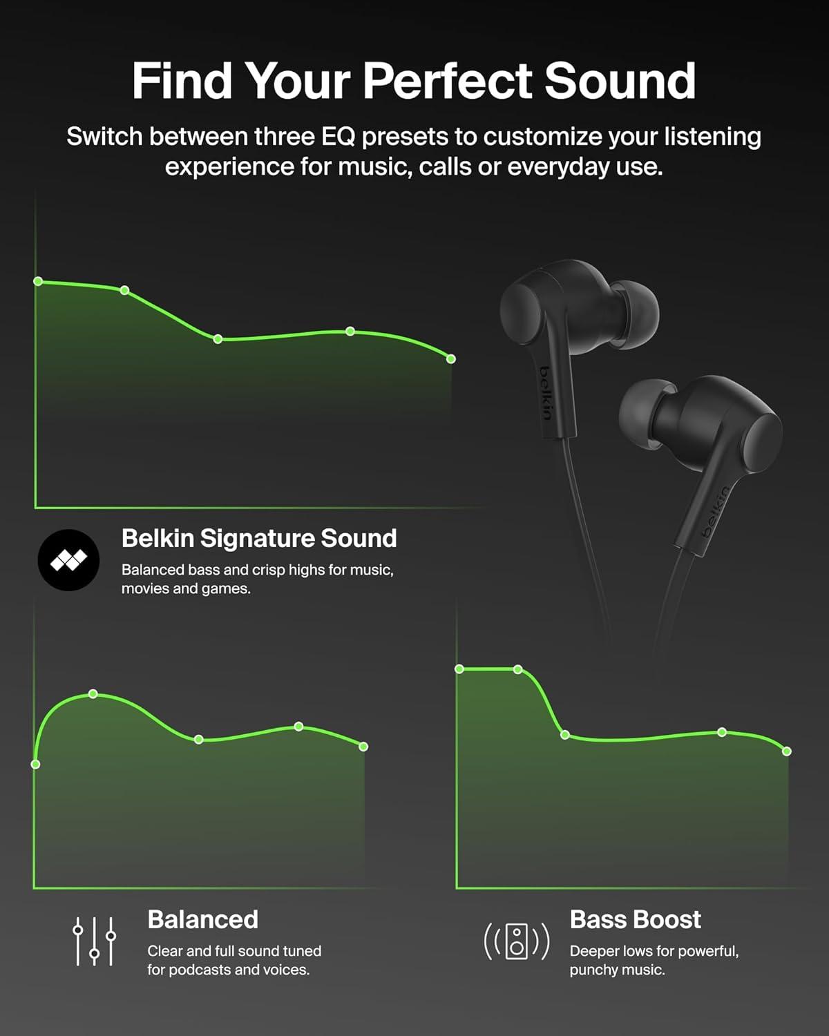 BASS BOOST, 3 EQ PRESETS: Enjoy Certified Hi-Res Audio with 12mm drivers tuned in our California audio lab for enhanced listening. Choose from Bass Boost, Belkin Signature Sound, or Balanced EQ presets to personalize your listening experience.