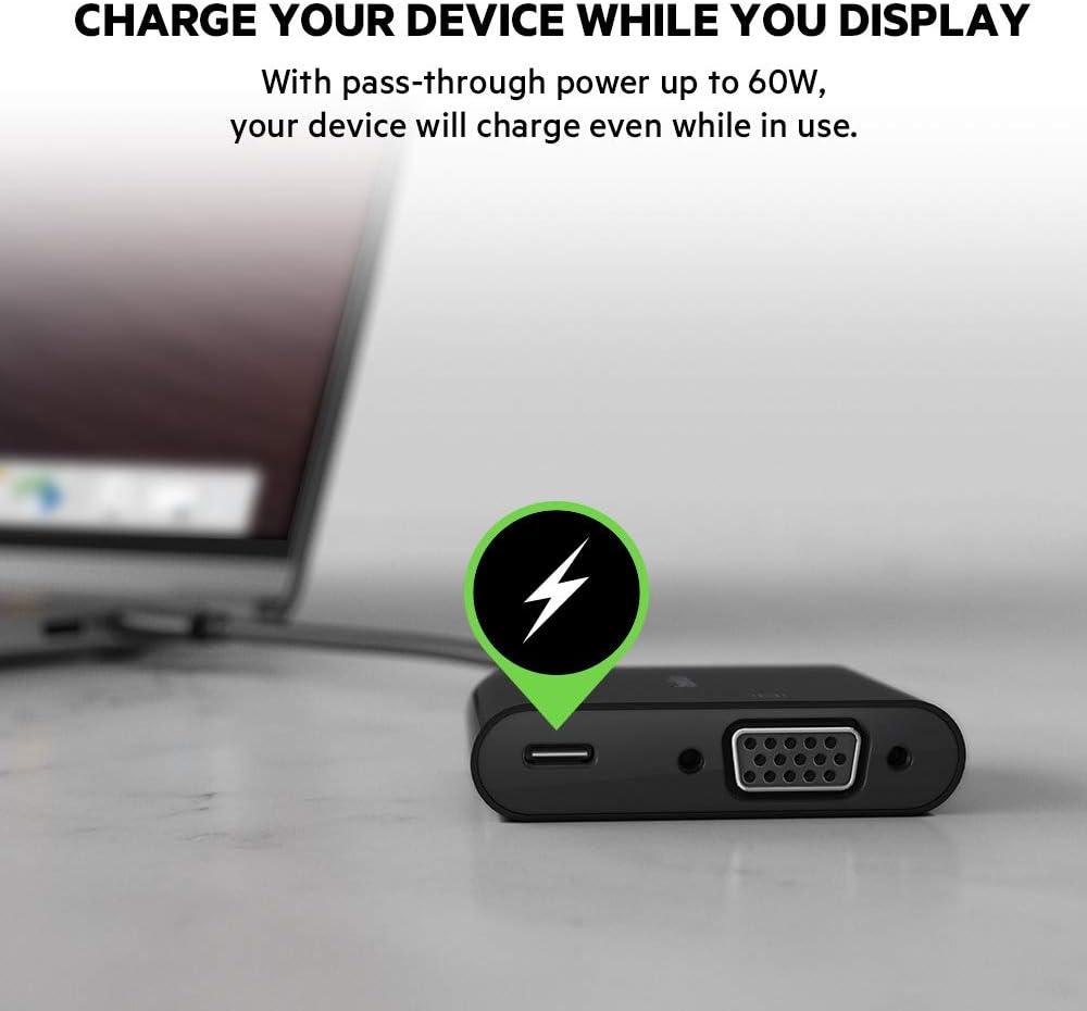 The USB-C to VGA + Charge Adapter connects to your laptop or tablet via USB-C port, giving you both a VGA port for video display and a USB-C port for power. Its plug-and-play design works universally with Mac and Windows laptops and other USB Type C devices. It offers portable flexibility that's great for classrooms, conferences, and trade shows. Keep your device charged while using your video display from a single USB-C port. Featuring pass-through USB-C Power Delivery up to 60W, your device will charge while displaying your content. This cable supports high-definition display on compatible devices, with resolutions up to 1920×1200 (1080p) at 60Hz.At a Glance, this USB-C to VGA adapter delivers up to 60W of power. This adapter supports HD-quality video resolutions up to 1920×1200 (1080p) at 60Hz and comes with a Belkin 2-year warrantySpecs:Width: 2.3”, Height: 0.55”, Length without cable: 1.57”, Cable Length: 5.1”Our Belkin USB-C to VGA + Charge Adapter is protected by Belkin’s 2-Year Limited Warranty. Belkin International, Inc. warrants to the original purchaser of this Belkin product that the product shall be free of defects in design, assembly, material, or workmanship for up to 2-years.