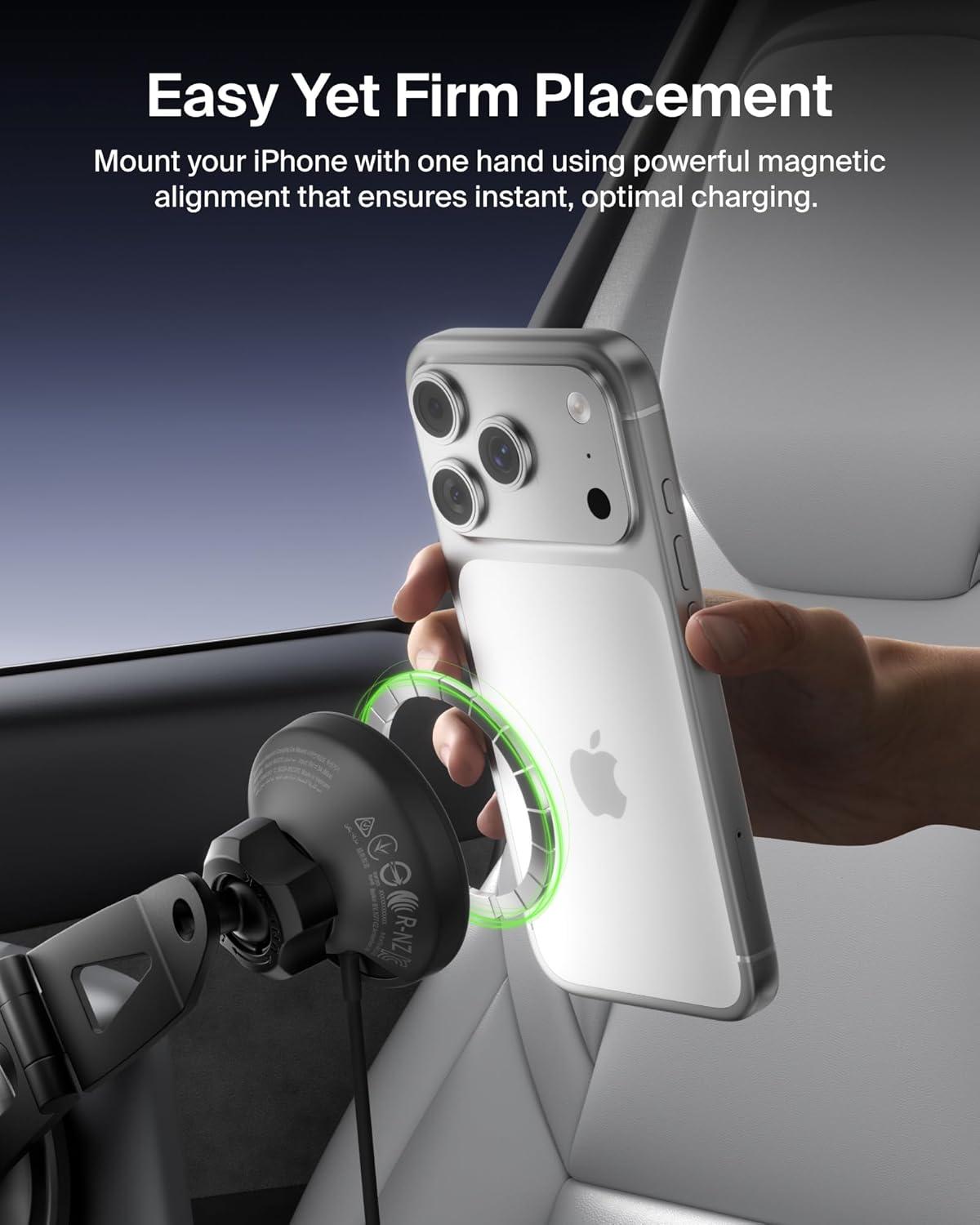 Belkin Wireless Car Charger, Magnetic Wireless Phone Mount for EV w/ 1M USB C Cable, Qi2 MagSafe Compatible Fast Charging for iPhone 17, Galaxy S25, Pixel 10, & More – Travel Accessories – Black