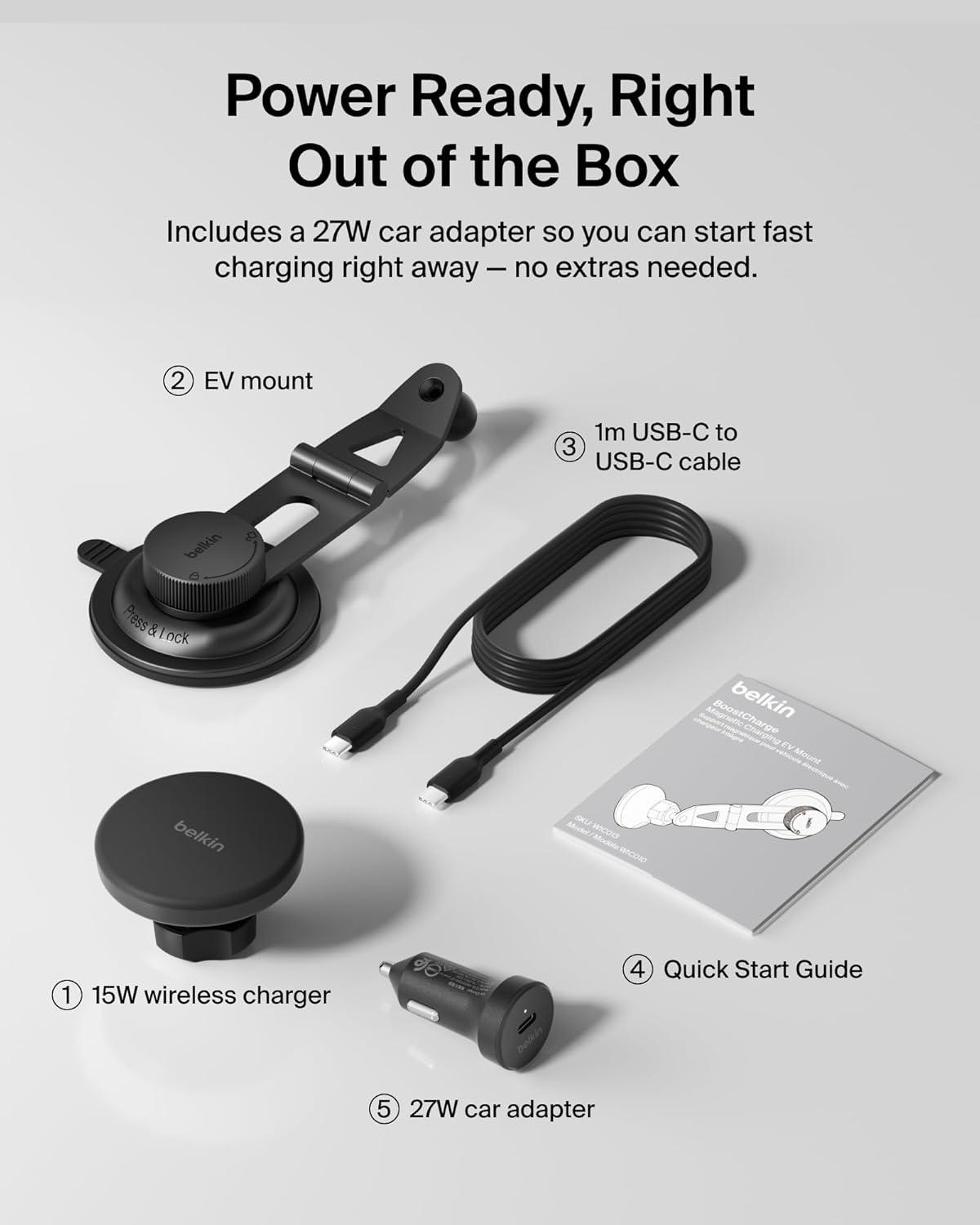 27W CLA & USB C CABLE INCLUDED: This Belkin Magnetic Car Charger comes with a 27-watt power supply and 1M USB C to USB C cable, so you can begin immediately charging right out of the box without the need to make any additional purchases.